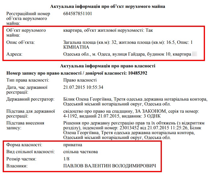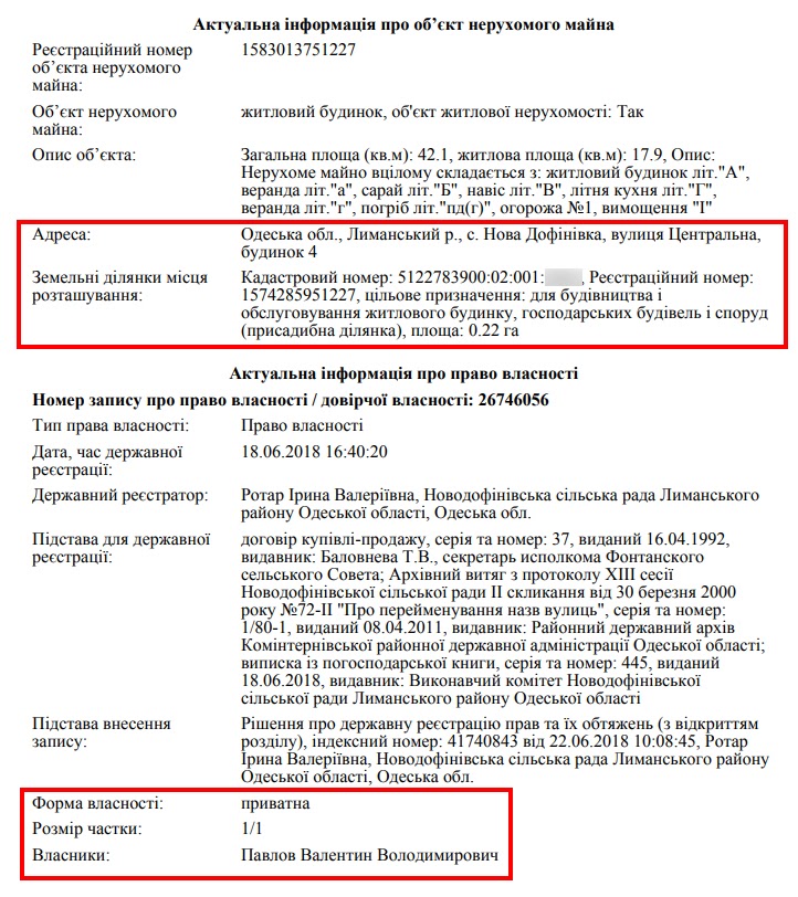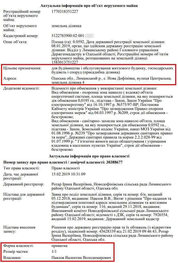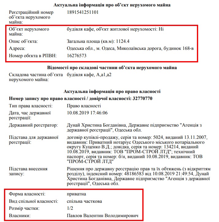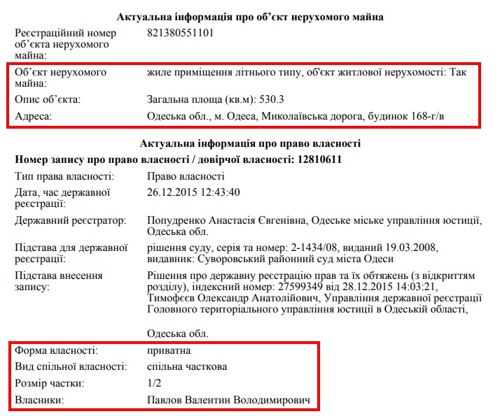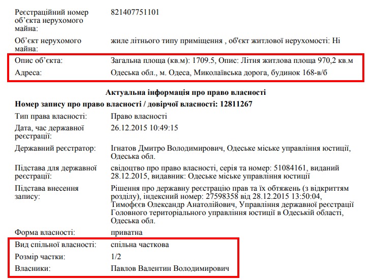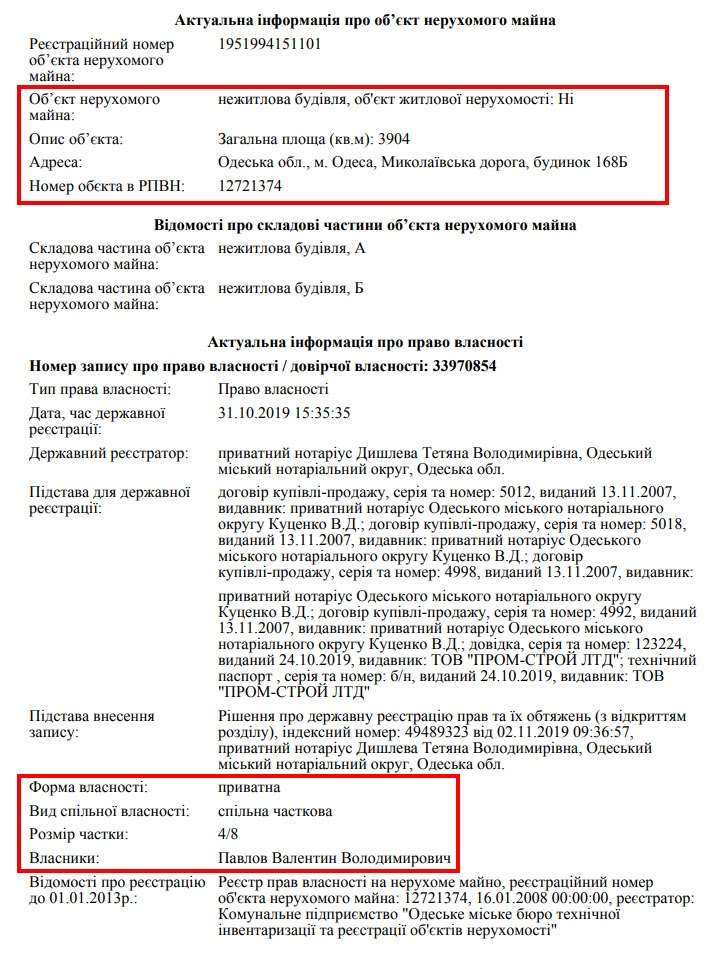 В собственности семьи Павловых мы насчитали около тридцати объектов недвижимости в пределах Одесской области. Из них ряд земельных участков под гостиницу получены бесплатно; приобретенные жилые и нежилые помещения. К примеру, судьбой одного из помещений отеля владеет и член ВСП Игорь Артеменко на основании договора купли-продажи от 2007 года.