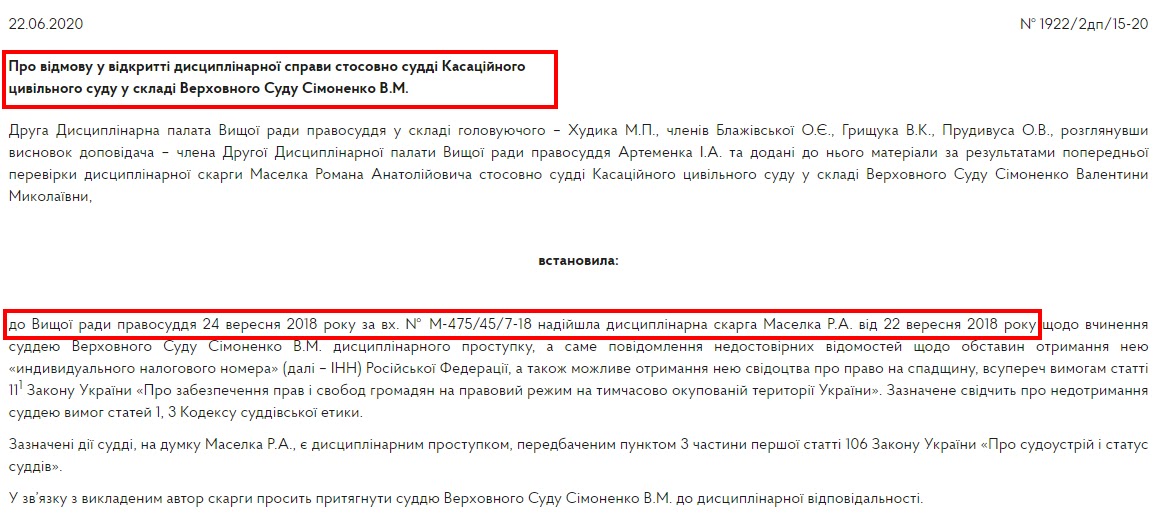 Похожая история произошла и с судьей Верховного Суда Валентиной Симоненко, жалоба на которую около двух лет пылилась. В 2018 году оказалось, что у нее есть налоговый номер Российской Федерации. Когда возник скандал, Симоненко сказала, что это просто оккупанты использовали старые базы данных и автоматически присвоили ей номер. Но это не могло быть правдой, потому что этот номер бил выдан на паспорт Симоненко, который она получила в 2015 году. То есть кто-то должен был предоставить агрессорам ее новые данные. Эта очевидная ложь и стала основанием для жалобы. Но с рассмотрением медлили. Лишь после того, как жалобщик обратился в суд на очевидное затягивание, Артеменко вынес жалобу на рассмотрение и просил в открытии производства отказать. Палата поддержала его и решила, что в действиях Симоненко нет никаких нарушений.