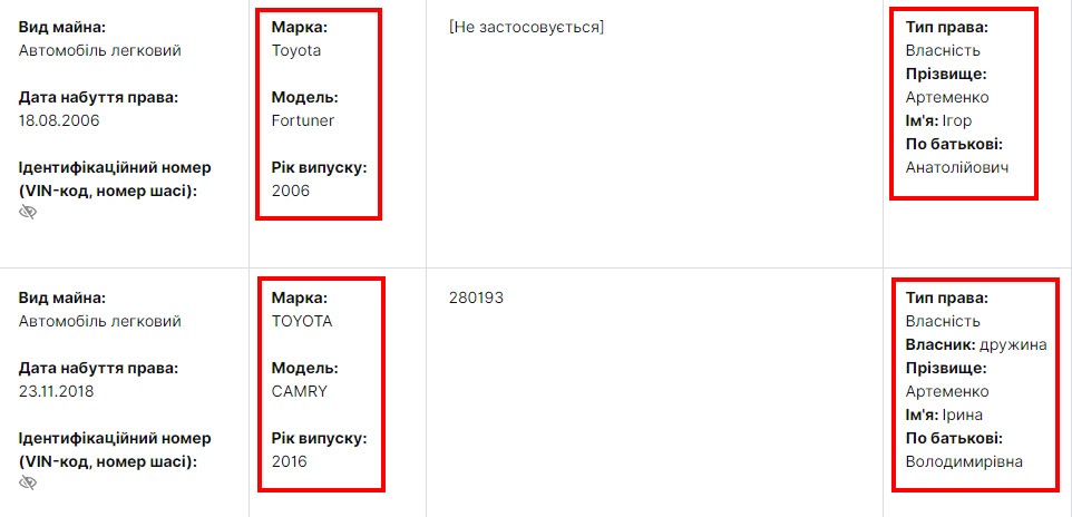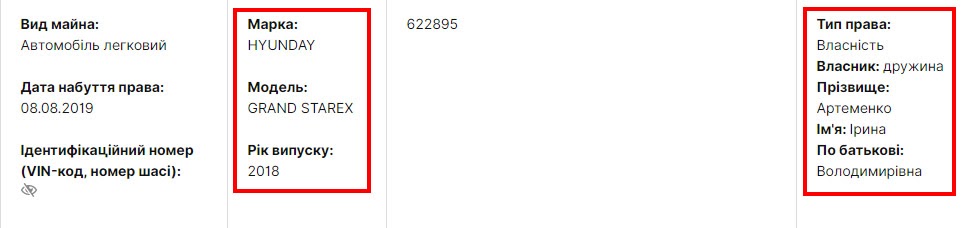 Если верить прошлогодний декларации Игоря Артеменко, в собственности его семьи три легковых автомобиля: Toyota Fortuner, Toyota Camry 2016 года выпуска за 280 тыс. грн и Hyundai Grand STAREX за 622 тыс. грн.
