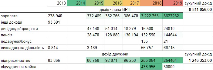 Мы проанализировали имущественные декларации Игоря Артеменко за 2013, 2014, 2015201620172018 і 2019 годы. С 2018-го он декларирует огромную зарплату члена Высшего совета правосудия - более 3 млн грн ежегодно. Кроме этого, имеет солидные проценты по вкладам, пенсию и вознаграждение за научную деятельность.