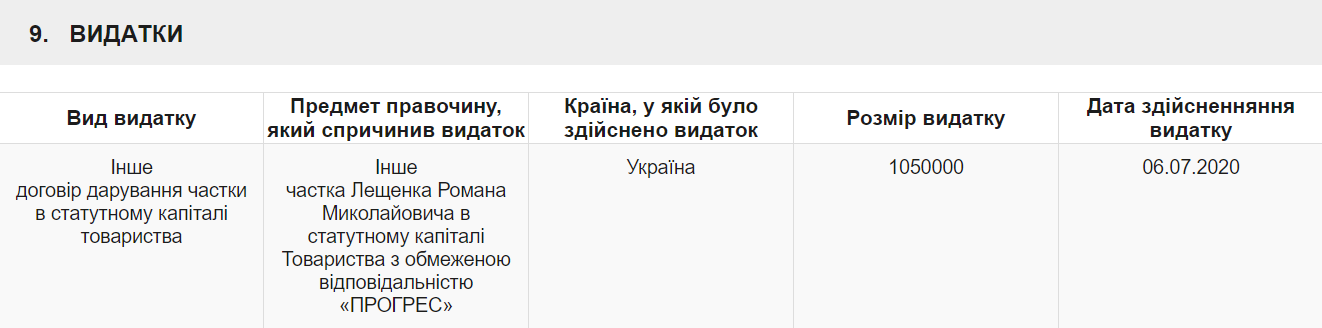 Другою, третьою і четвертою змінами Лещенко задекларував видатки – договори дарування його часток в статутному капіталі ТОВ “Прогрес”, ТОВ “Іллюмін” та ТОВ “Прогрес-молоко”.