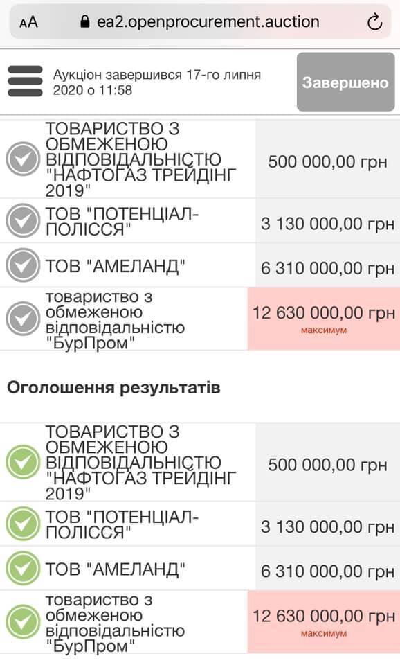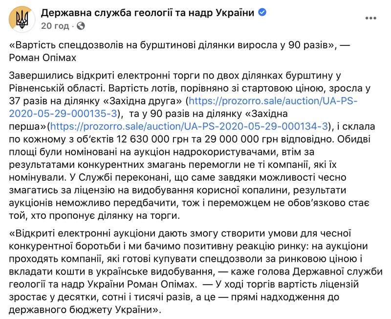 "Сегодня состоялись первые аукционы на получение специальных разрешений на пользование недрами. Напомню, два участка в 10 га в Алексеевке Сарненского района выставили на сайте "Прозорро" еще в июне. А уже 17 июля состоялось онлайн торги. Результат – превзошел все наши ожидания", – сказано в сообщении.