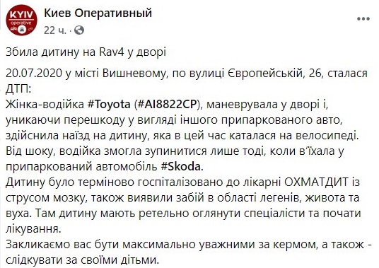"В городе Вишневом, по улице Европейской, 26 произошло ДТП: Женщина-водитель #Toyota (#AI8822CP), маневрировала во дворе и, избегая препятствия в виде другого припаркованного авто, совершила наезд на ребенка, который в это время катался на велосипеде", - указано в сообщении.
