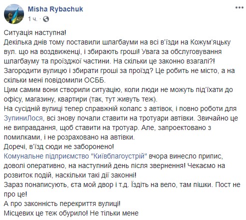 "Насколько это законно вообще?! Загородить улицу и собирать деньги за проезд? Это делает не город, а на сколько мне сообщили ОСМД. Тем самым они создали ситуацию, когда люди не могут подъехать к офису, магазину, квартире. На соседней улице теперь настоящий коллапс из машин, и полно работы для ОстановиЛося, все снова начали ставить на тротуары автомобиля. Обычно это не оправдание, чтобы ставить на тротуар. Но, запроектировано с ошибками, и не рассчитано на автомобили", - пишет он.
