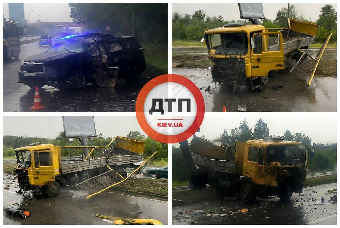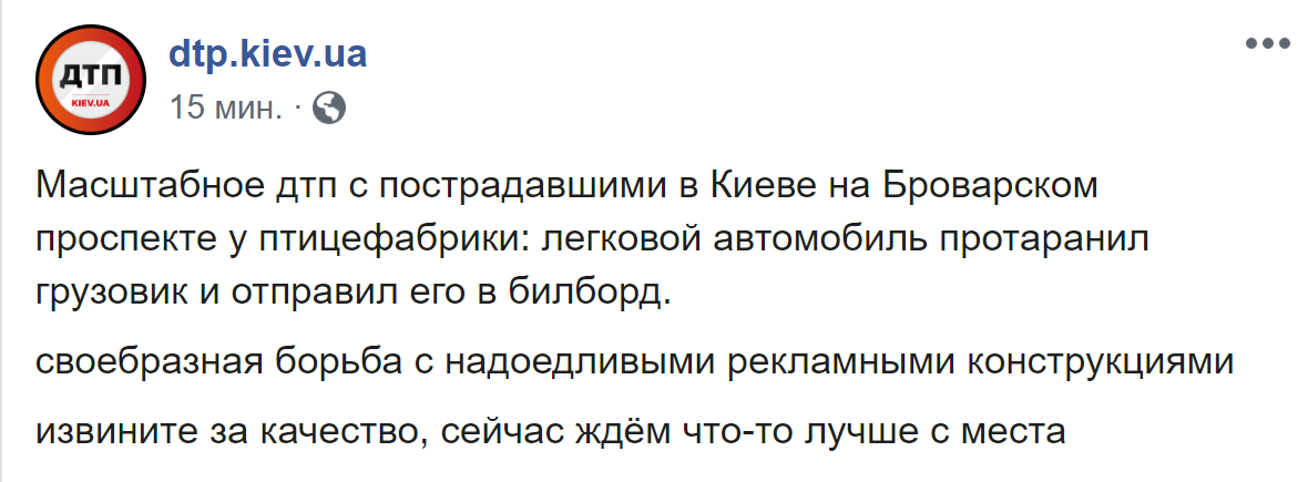 "Масштабное ДТП с пострадавшими в Киеве на Броварском проспекте, возле птицефабрики: легковой автомобиль протаранил грузовик и отправил его в билборд", – говорится в посте.