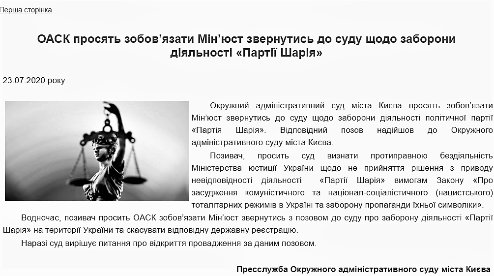 В пятницу 23 июля в Окружной административный суд города Киева поступил иск с требованием обязать Минюст обратиться в суд по поводу запрета деятельности политической партии «Партия Шария». Не, ну мы же теперь полностью осведомлены, как работает схема.