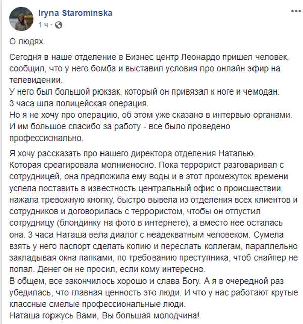 Как известно, «киевский террорист», узбек по национальности, в киевском банке в БЦ «Леонардо» взял в заложники руководителя отделения банка Наталью Чучупак.