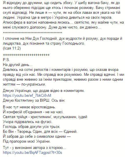 "Не только я — слышно, как и на других рядах все внимание на того человека. Украина едет в метро и Украина смотрит на своих героев. Атмосфера в вагоне наполнена какой-то... святостью, которую почти слышно, на грани слухового диапазона. Очень очень чисто, аж звонко..." - написал он.
