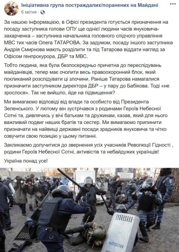 "По нашей информации, в Офисе президента готовится назначения на должность заместителя председателя ОПУ еще одного человека Януковича-Захарченко – заместителя начальника главного следственного управления МВД того времени Олега Татарова. То есть человек, который был непосредственно причастен к преследованиям майдановцев, теперь должен возглавить весь правоохранительный блок, который призван расследовать эти преступления … Мы требуем ответа от власти и лично от президента Зеленского. В феврале он встречался с семьями Героев Небесной Сотни и, глядя в глаза родителям и женам, говорил, который для него важен подвиг наших братьев и сестер. Мы требуем прекратить назначать на высшие государственные должности предателей Януковича и четко озвучить свою позицию в этом вопросе", – говорилось в заявлении группы на странице в Facebook.