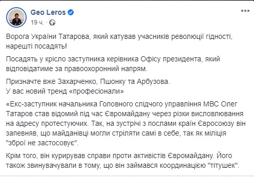 "Врага Украины Татарова, который пытал участников революции достоинства, наконец посадят! Посадят в кресло заместителя руководителя Офиса президента, который будет отвечать за правоохранительный направление. Назначьте уже Захарченко, Пшонку и Арбузова. У вас новый тренд "профессионалы", - написал он на своей странице в Facebook.