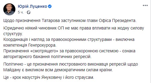 "О назначении Татарова заместителем главы Офиса Президента. Юридически никакой чиновник ОП не имеет права влиять ни на одну силовую структуру. Координация и надзор за правоохранительными структурами - исключительная компетенция Генпрокурора. Назначение "смотрящего" по правоохранительной системе - признак авторитарного желание политических репрессий. Политически – это назначение люстрованого исполнителя репрессий в отношении Майдана является вызовом всем демократическим силам страны. Это шаг навстречу Януковичу и его страусам", – заявил он.