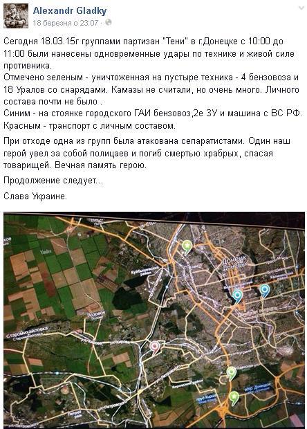 В соцсети кроме заставочной фотографии можно найти снимки, сделанные совместно с лидером «Правого сектора» Дмитрием Ярошем, а также фотографии, якобы доказывающие успешность диверсионной работы «Теней». Установить причастность диверсантов к уничтожению предателей и российских наемников на Донбассе, руководствуясь лишь информацией из Facebook Александра, весьма сложно. Это признает и сам Гладкий. Однако отдельные доказательства, выложенные на его страничке, заслуживают, как минимум, внимания. Так, например, недавно он сообщил информацию о проблемах террориста Моторолы, вплоть до номера палаты в больнице Ростова-на-Дону, в которой лежит известный боевик. Это позволяет предположить, что информаторы у партизан действительно есть, и находятся они на различных уровнях в лагере врага. Партизаны также сообщали о покушениях на лидеров боевиков Мозгового и Гиви.