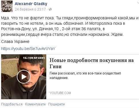 Недавно вы писали, что боевик Моторола находится в Ростове-на-Дону, в реанимации. Какая информация о нем есть у вас на сегодняшний день?