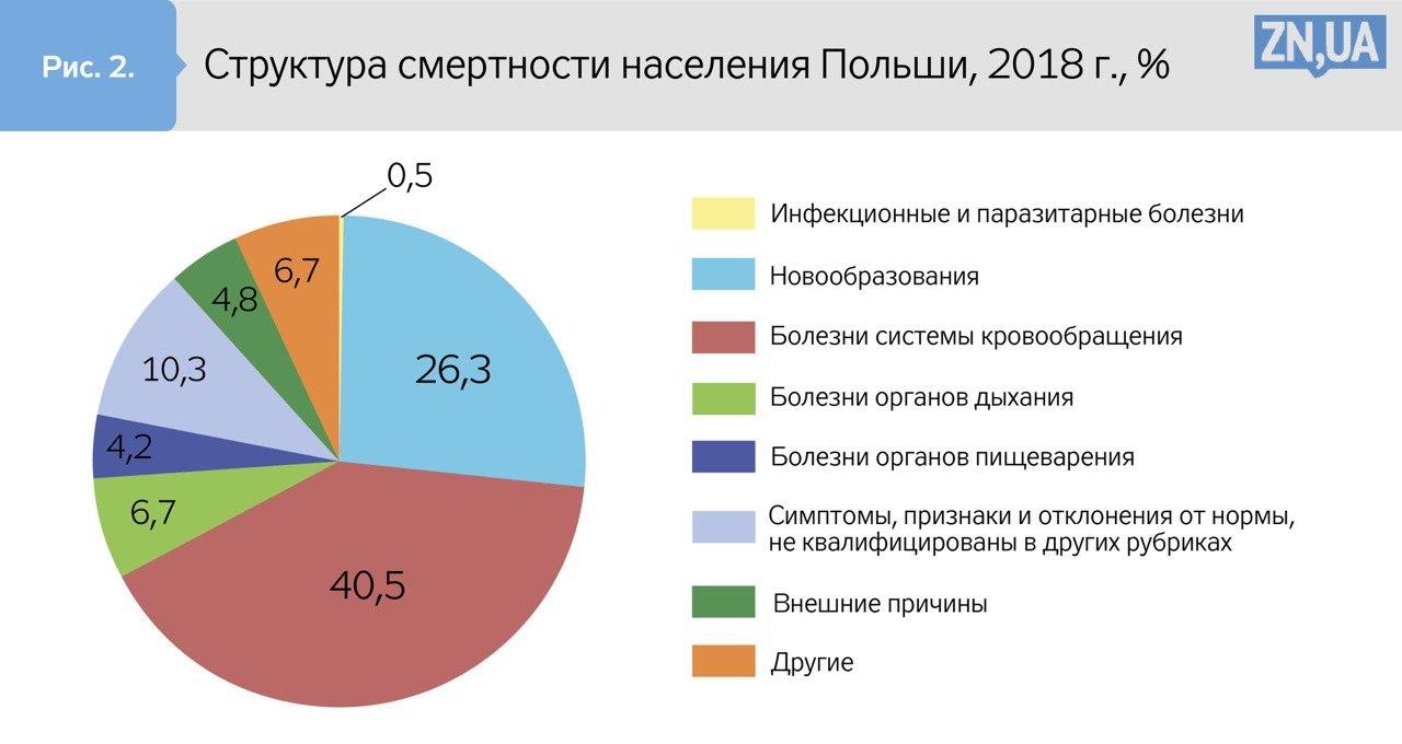 Что у других? Интересно сравнить с ситуацией у ближайшей соседки — Польши — стране, близкой по природным и климатическим условиям, с преимущественно славянским населением, схожими пищевыми предпочтениями, любовью к крепким алкогольным напиткам и даже традицией варить местный самогон — бимбер. Не забываем, что это страна бывшего социалистического лагеря, как и Украина. Она прошла через мучительную перестройку социально-экономического порядка. В Польше прогрессирует старение населения, усиленное оттоком молодежи и людей среднего возраста на учебу и работу в более привлекательные страны (что стало значительно легче делать после ее присоединения к ЕС). Поэтому можно было бы ожидать и похожего распределения смертей по причинам. Однако, например, сердечно-сосудистые заболевания имеют в Польше меньшую значимость, отвечая менее чем за половину (40,5%) смертных случаев (у нас — за две трети!). Зато доля новообразований вдвое больше. Вряд ли это свидетельствует о худшей эпидемиологической ситуации относительно онкозаболеваний, скорее, это результат лучшего диагностирования и более качественного определения причины смерти. Намного меньше поляков гибнут вследствие инфекционных заболеваний, зато больше – от болезней органов дыхания (рис.2).