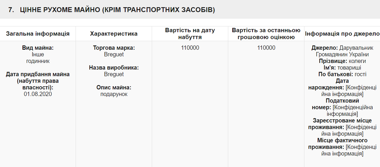 Ним виявився швейцарський годинник Breguet, подарований “колегами, товаришами і гостями”. Принаймні, саме цих людей політик вказав як джерело доходу.