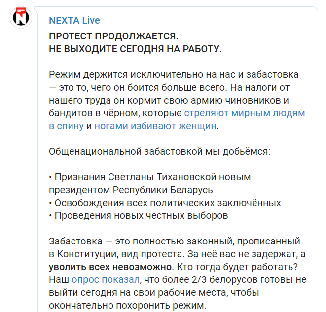 "Кто тогда будет работать? Наш опрос показал, что более 2/3 белорусов готовы не выйти сегодня на свои рабочие места, чтобы окончательно похоронить режим", – утверждают они.