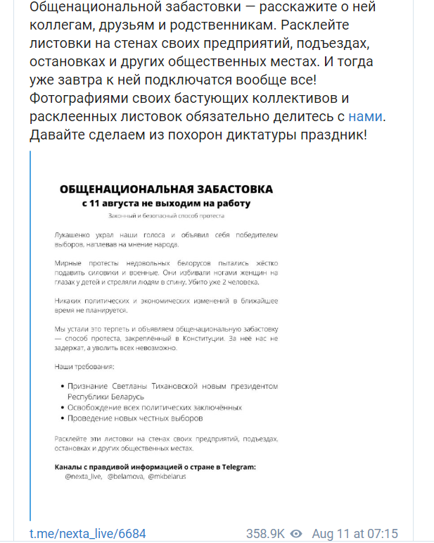 Белорусы объявили общенациональную забастовку (Telegram-канал NEXTA Live)
