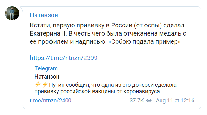 "Кстати, первую прививку в России (от оспы) сделала Екатерина II. В честь чего была отчеканена медаль с ее профилем и надписью: "Собою подала пример", – добавил Telegram-канале "Натанзон".