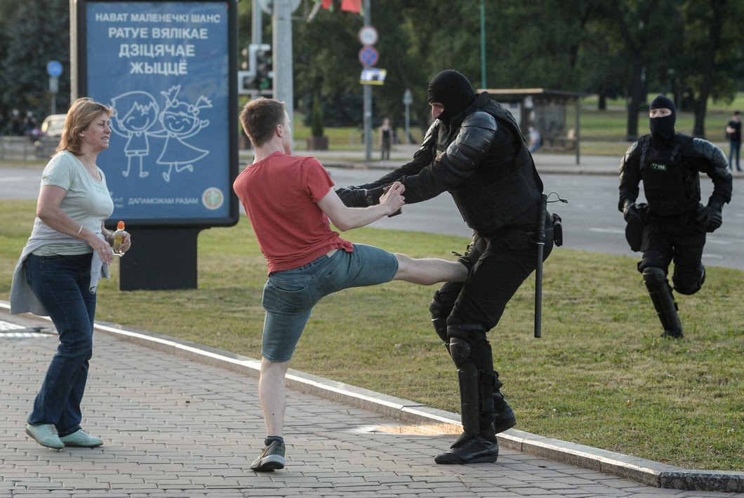— Люди, что же вы стоите всееее! 84 процента! (имеется в виду результат Лукашенко на выборах, в который вряд ли кто в Беларуси верит), — вдруг надрывно кричит парень в розовой майке всем, кто нерешительно мнется на почтительном расстоянии от передовой группы протестующих. Парню никто не отвечает, многие прячут глаза, но здесь, на проспекте Победителей, сегодня буйных нет.