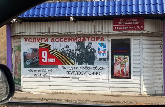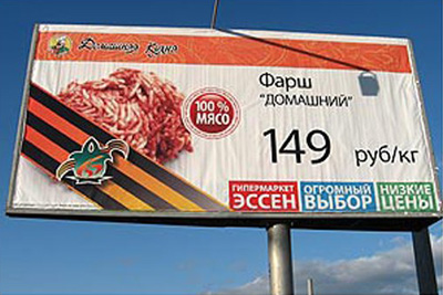 А в Набережных Челнах, недолго думая, приказали перевязать «георгиевскими ленточками» все билборды вдоль дорог. Мало того, что ленты почти везде перекрыли контактную информацию рекламодателя, так ещё и сочетания местами получились довольно зловещие:
