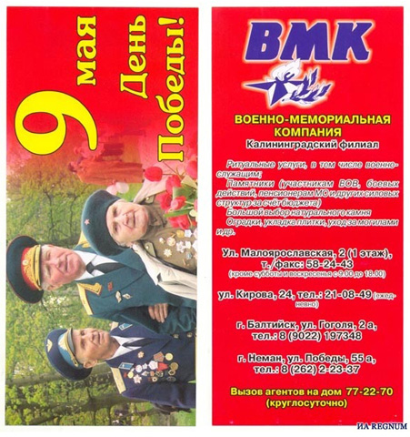Есть и куда более мрачные примеры. Калининградский филиал Военно-мемориальной компании к 9 мая 2007 г. распространил буклеты, в которых поздравил ветеранов, а заодно, не отходя от кассы, предложил их же и похоронить.