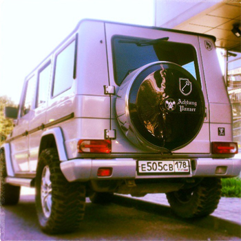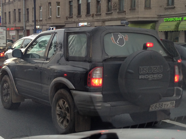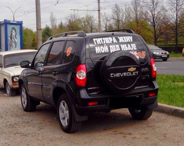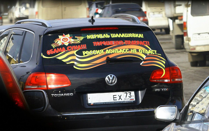 Отдельного рассмотрения достойна тема автомобильных стикеров. Вот что бывает, когда люди, чей культурный уровень ограничивается наклейками «Х#лиган» или «Hunter behind heads», ударяются в патриотический угар: