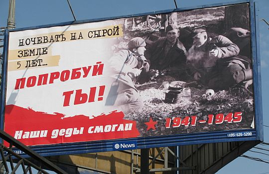 Если уж на то пошло, Великая Отечественная длилась не пять лет, а чуть меньше четырёх. Но главное - это, конечно же, призыв-слоган «Попробуй ты!», более уместный на бутылке с газировкой. Мне почему-то кажется, что наши деды сражались как раз за то, чтобы им и их потомкам никогда больше не приходилось спать на сырой земле. Но, видимо, авторы плаката считают иначе.