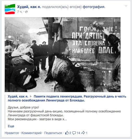 Солидарны с ними и админы фитоняшного паблика, предложившие в юбилей освобождения Ленинграда от блокады устроить лечебно-патриотические голодания.
