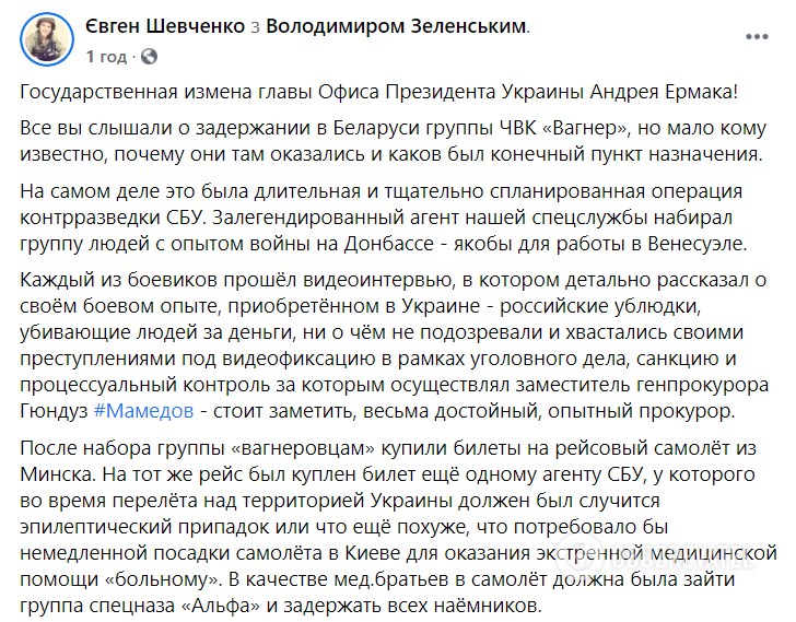Агент Национального антикоррупционного бюро, ветеран АТО Евгений Шевченко заявил, что задержание в Беларуси группы ППК "Вагнер" было долгой и тщательно спланированной операцией контрразведки СБУ, проведение которой сорвал глава Офиса президента Андрей Ермак.