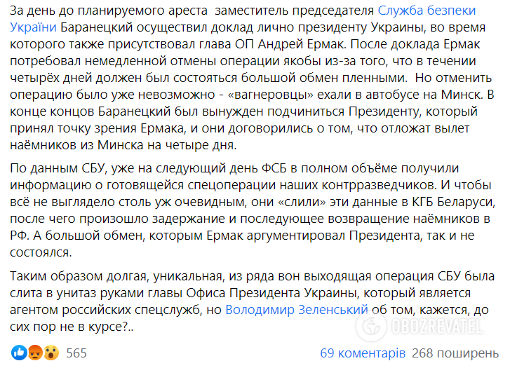 Он отметил, что отменить операцию было уже невозможно, поскольку вагнеровцы направлялись в столицу Беларуси на автобусе. Также добавил, что вскоре Баранецкий "был вынужден подчиниться президенту, который принял точку зрения Ермака". Все они, заявляет ветеран АТО, якобы договорились о том, что отложат вылет наемников из Минска на четыре дня.