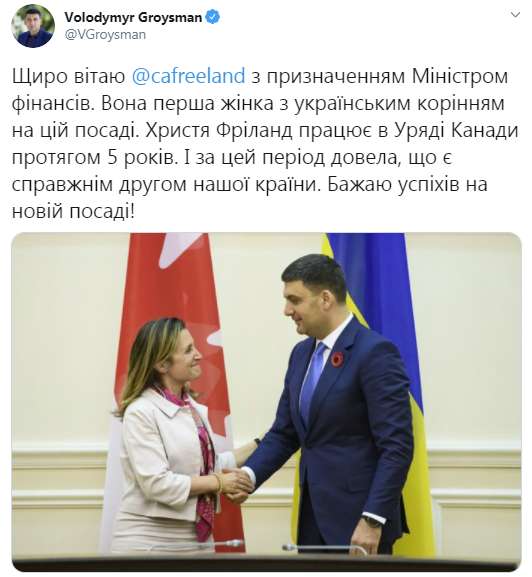 Бывший украинский премьер-министр Владимир Гройсман поздравил Фриланд с новой должностью, назвав политика другом Украины.