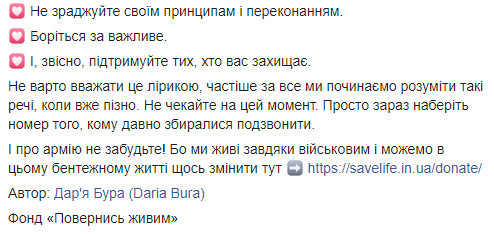 "Есть же элементарные вещи, такие простые-простые. Позвоните родным. Сделайте так, чтобы кто-то улыбнулся. Скажите, что вы любите тому, кому хотите. Измените то, от чего вам некомфортно. Не жалейте о том, что было, но исправьте то, что не дает покоя. Совершенствуйтесь в собственной чувственности. Не предавайте своих принципов и убеждений. Боритесь за важное. И, конечно, поддерживайте тех, кто вас защищает", – призвала журналистка сознательных украинцев.