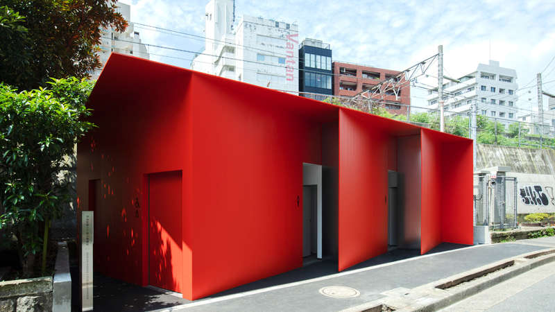 Фасад туалета выполнен из ярко-красного металла. Его дизайн напоминает складки подарочной бумаги. Эта техника называется аригато. Так в Японии заворачивают подарки в знак благодарности.