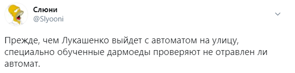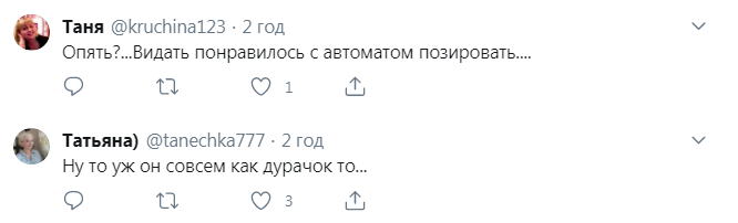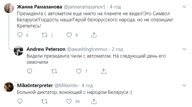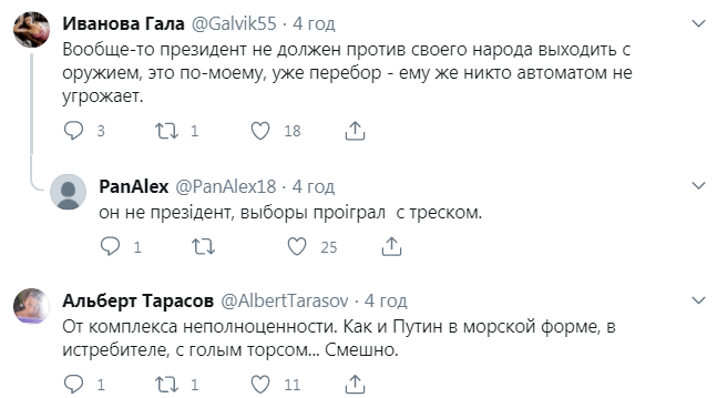 "Прежде чем Лукашенко выйдет с автоматом на улицу, специально обученные дармоеды проверяют, не отравлен ли автомат", "Картошку пусть идет копать, ему это привычнее, чем автомат держать", "От комплекса неполноценности. Как и Путин в морской форме, в истребителе, с голым торсом", – пишут пользователи.