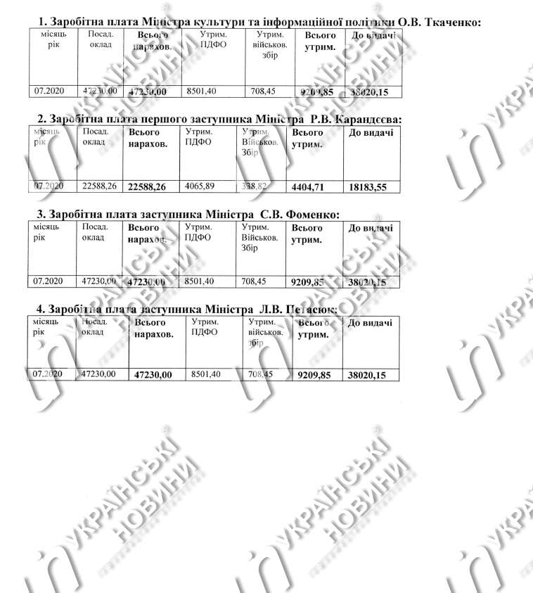Сумма средств, начисленная Ткаченко в июле, составила 47 230 гривен. Фактическая сумма, полученная министром после удержания налогов и сборов, составила 38 020 гривен. Зарплата первого заместителя Ростислава Карандеева (назначен 15 июля) составила 22 588 гривен, заместителей министра Светланы Фоменко – 47 230 гривен, Ларисы Петасюк – 47 230 гривен.