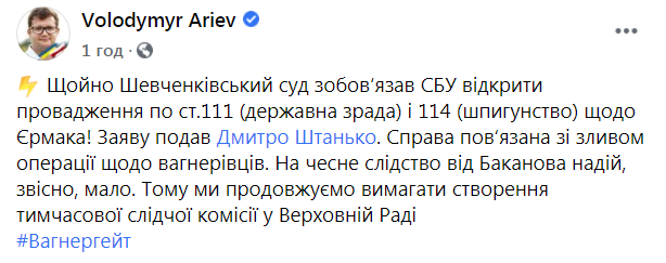 Об этом в Facebook 9 сентября сообщил нардеп из "Европейской Солидарности" Владимир Арьев. Он уточнил, что расследование будет идти по статьям 111 и 114 УК.