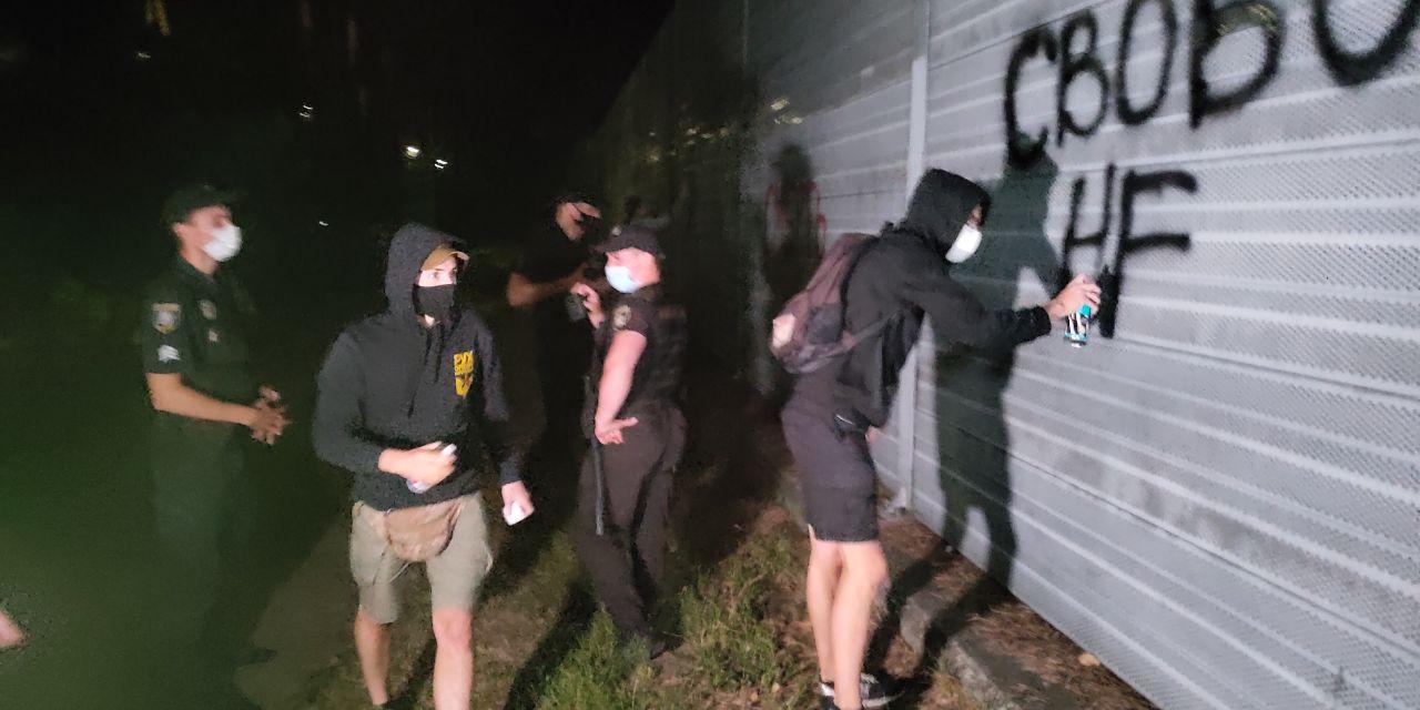 Після цього ряд активістів розписали паркан президентської резиденції гаслами “Імпічмент”, “Свобода” та іншими.