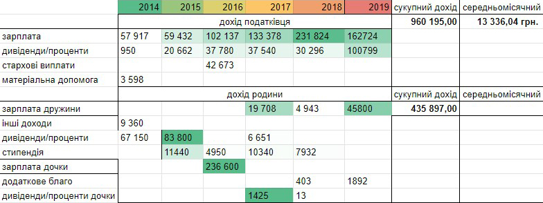 Ми також переглянули декларації Анатолія Федоровича за 2014, 2015, 2016, 2017, 2018 та 2019 роки. Сисюк отримує середньостатистичну зарплату державного службовця, а також має проценти за вкладами. Дружина Оксана Сисюк за попередній рік офіційно отримала дохід на рівні мінімальної зарплати. Цікаво також, що дочка Христина у 2016 році отримала 236 тис. грн доходу зі США.