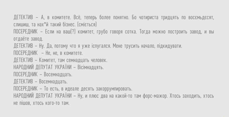 «Ну, конечно. Мы, во-первых, остаток не получим. Во-вторых, там же куча людей тоже, ну, никаких. Они понимают, что сейчас меня поддержат, когда-то я к ним пойду с другим вопросом… А так не приду никогда уже. Ну, типа, если так пролетит история… Вот как посмотришь в фейсбуке, ты думаешь, меня не знают… Ну, конечно, знают все. Знают, что со мной портить отношения из-за какой-то, блядь, там двадцатки, ну, типа, десятки… Ну, типа, где смысл?» — сказал якобы нардеп.