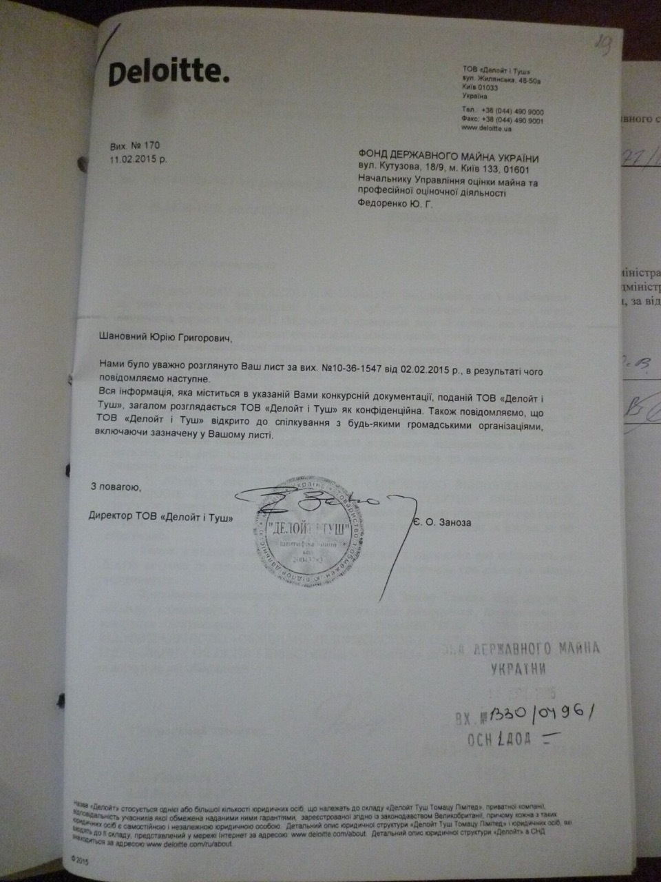 Причем оказалось, что свои услуги «Делойт і Туш» оценила даже не на сумму по конкурсу, а меньшую... И СМИ, и само Министерство инфраструктуры сообщали о стоимости оценки в 10 000 гривен, а вот в письме уже ФГИ сообщается уже иная цифра — 12 000 гривен, и иной срок процедуры оценки — в один месяц...