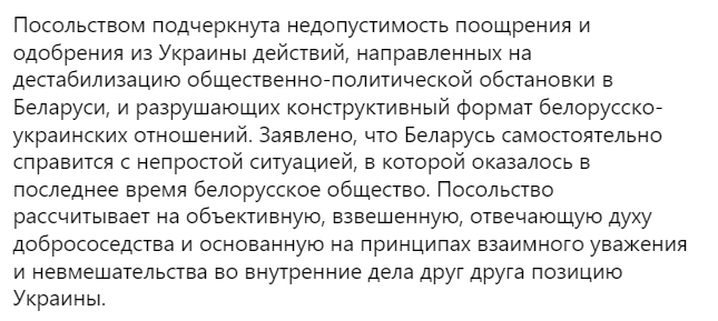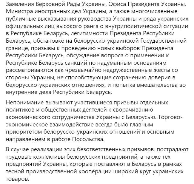 “Заявления Верховной Рады Украины, Офиса президента Украины, министра иностранных дел Украины, а также многочисленные публичные высказывания руководства Украины и ряда украинских официальных лиц высокого ранга о внутриполитической ситуации в Республике Беларусь, легитимности президента Республики Беларусь, обстановке на белорусско-украинской государственной границе, призывы к проведению новых выборов президента Республики Беларусь, обсуждение вопроса о применении к Республике Беларусь санкций по надуманным основаниям рассматриваются как чрезвычайно недружественные жесты со стороны Украины, не способствующие сохранению доверия в белорусско-украинских отношениях, и попытка вмешательства во внутренние дела Республики Беларусь”, – сказано в сообщении.
