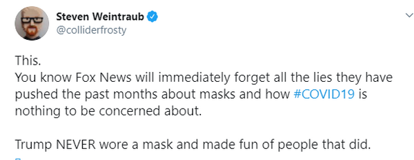 А журналист Стивен Вайнтрауб так прокомментировал сообщение Fox News: «Fox News немедленно забывает всю ложь, которую они распространяли последние месяцы о масках и о том, что о COVID19 не стоит беспокоиться. Ведь Трамп никогда не носил маску и высмеивал людей, которые носили маски».