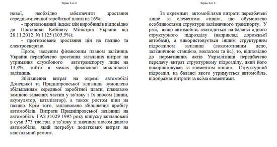 "Збільшення витрат на автомобілі Донецької та Придніпровської залізниць зумовлено збільшенням зарплати, плановою заміною запчастин у зв’язку з їх зношенням, ростом цін на пальне. Заплановано збільшення пробігу автомобілів.