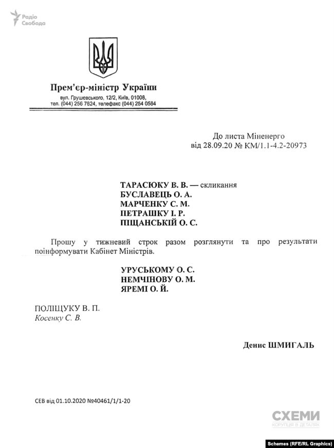 1 жовтня прем’єр-міністр Денис Шмигаль дав доручення у тижневий строк розглянути лист міністерки енергетики та про результати поінформувати Кабінет міністрів. Про це йдеться в листі за підписом Шмигаля на керівників низки профільних органів влади, який наводять журналісти «Схем».