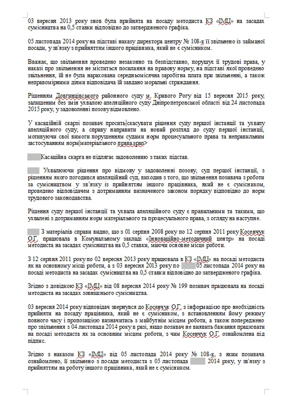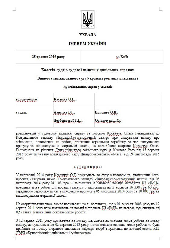 В частности, из этого решения следует, что в ноябре 2014 г. Косенчук А. Г. обратилась в суд с иском и, уточнив его, просила отменить приказ коммунального учреждения «Инновационно-методический центр» от 5 ноября 2014 № 108 о ее увольнении с занимаемой должности методиста КУ «ИМЦ», восстановить ее на работе в этой должности, взыскать с ответчика в ее пользу 16 338 грн 60 коп. среднего заработка за время вынужденного прогула с 5 ноября 2014 и 10 000 грн на возмещение морального ущерба.