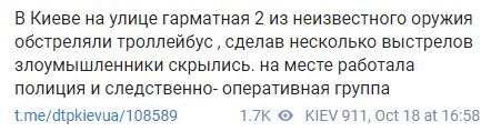 "В Киеве на улице Гарматная, 2 из неизвестного оружия обстреляли троллейбус, сделав несколько выстрелов злоумышленники скрылись. На месте работала полиция и следственно-оперативная группа", – передает dtp kiev ua.