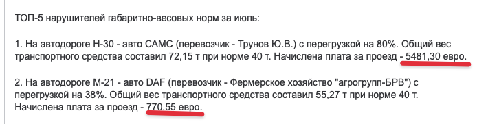 Нарушителю №2 с 17 тоннами перегруза насчитали 212,48 евро, нарушителю №4 с перегрузом в 11 тонн написали уже 16,80 евро, зато нарушителю №5 с перегрузом в 32,23 тонны аж 15,80 евро. Вообще неясно, кто эти данные готовит министру и зачем он транслирует подобную полнейшую чушь на всеобщее обозрение. Как у министра получилось при перегрузе автопоезда почти вдвое от разрешенного веса (нарушитель №5) получить перегруз только в 58% - вообще непонятно. Элементарная арифметика страдает, тут уже не до государственного подхода к делу. Или только “отнимать и делить” обучены, а чуть более сложное - уже выше понимания? Похоже, так оно и есть. Тем более, если сравнивать с нарушителями июля 2020 года, где при тех же весовых нарушениях акты пишут в тысячах евро: