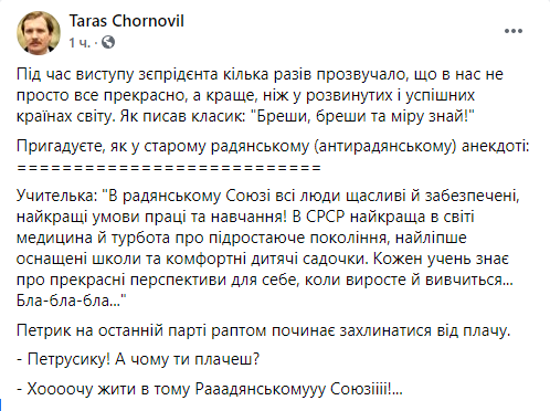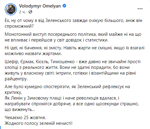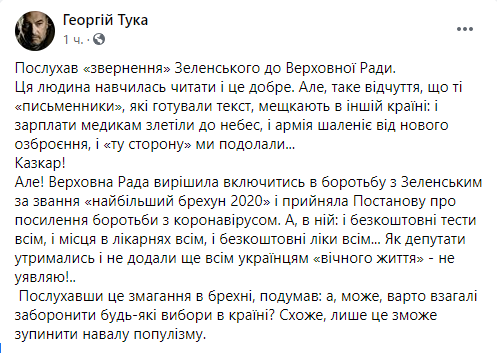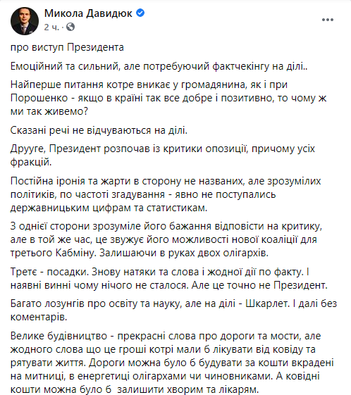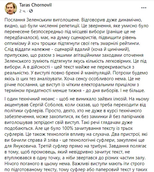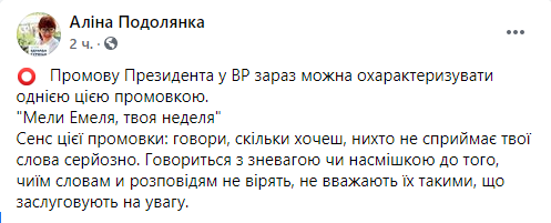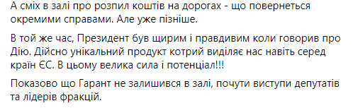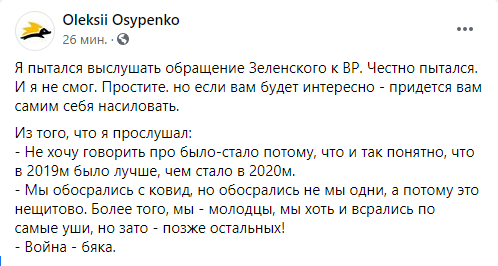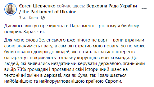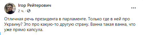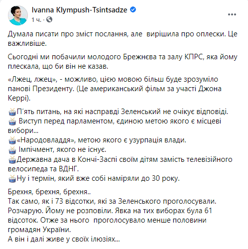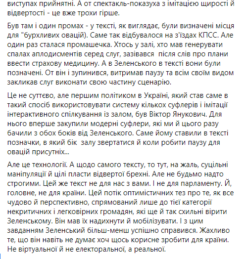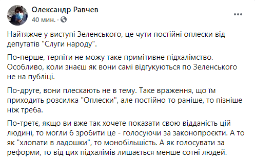Некоторые политики уже назвали выступление Зеленского в парламенте агитацией за партию “Слуга народа” перед местными выборами и обвинили его в оторванности от украинских реалий. Речь в стиле “все хорошо” на фоне катастрофической ситуации в стране изрядно разозлила пользователей украинского сегмента Facebook. Другим же происходящее напомнило съезды КПСС, ведь “слуги” просто взрывались в овациях после каждой фразы Зеленского.