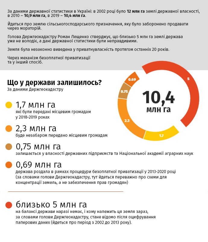- Когда вам говорили, что в стране 10 млн га земель государственной собственности, то это была ложь. Страна фактически разграблена. Осталось очень мало - около 2 млн га мы передаем в объединенные территориальные общины, и остается свободных 0,75 млн га.