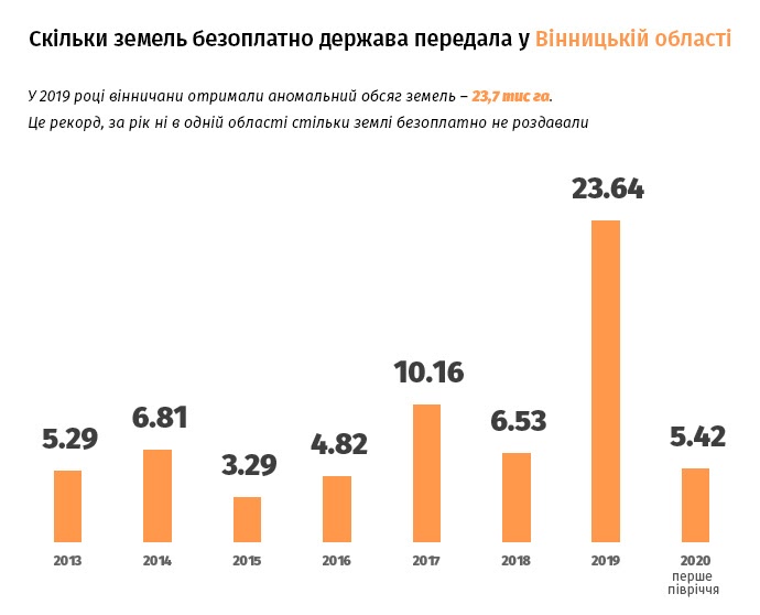 Когда мы анализируем бесплатную приватизацию по стране, то четко видно, сколько десятков тысяч гектаров государственной земли вывели в частную собственность в Винницкой области.